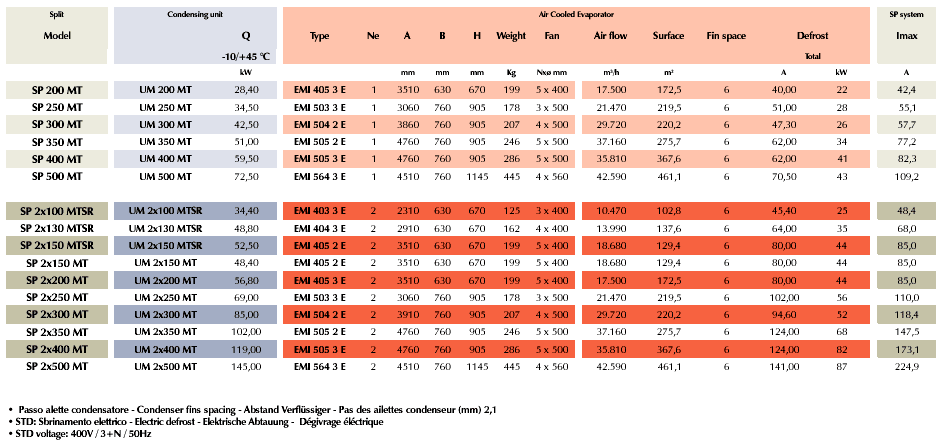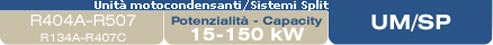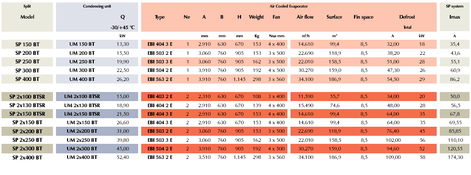 SP разладни сплит системи се составени од кондезатор на воздух за надворешна инсталација, аероиспарувач и далечинска командна табла. Серијата SP предвидува солуции со еден или два компресори со независни разладни цирклулации. Серијата SP е предвидена со херметички, полухерметички алтернативни или со полухерметички компресори на навојна компресија.